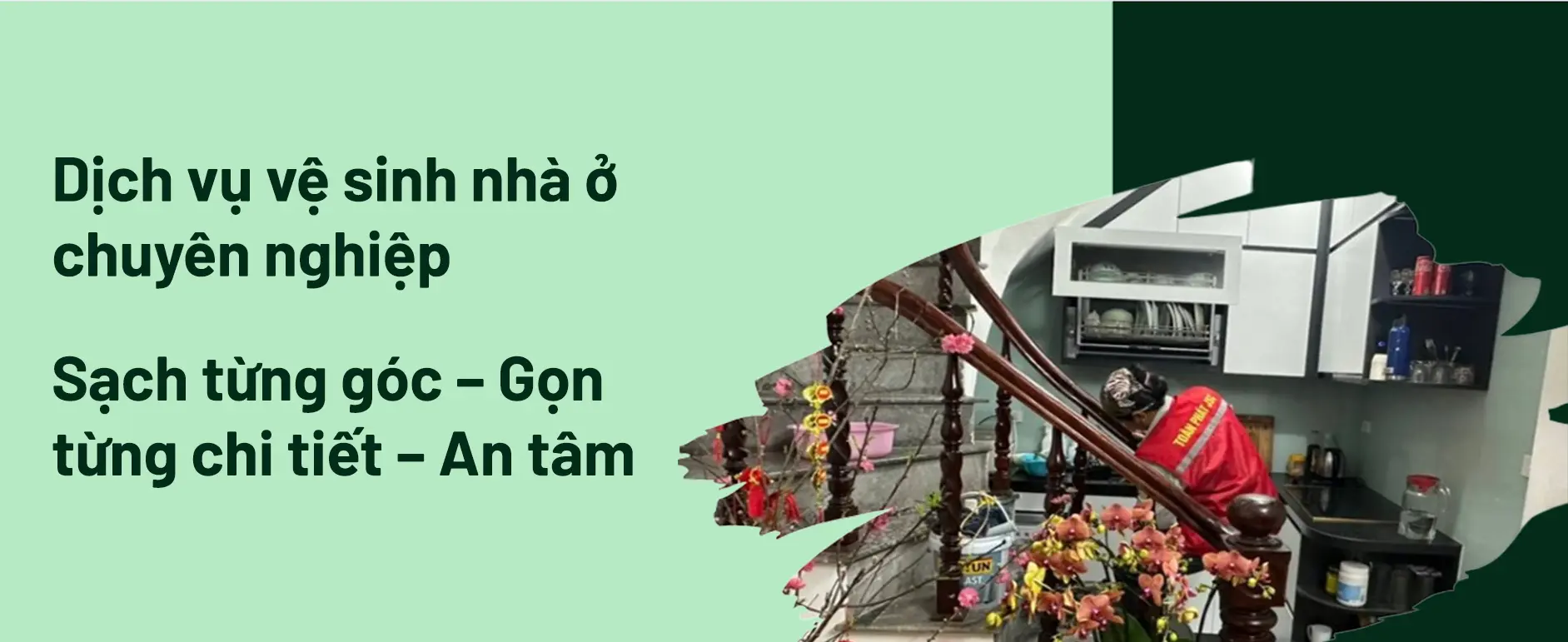 Dịch vụ vệ sinh nhà cửa của Toàn Phát là dịch vụ cho thuê người dọn vệ sinh nhà, chúng tôi sẽ đến tận nhà để xử lý bụi bẩn, dầu mỡ, mạng nhện, thức ăn, tóc, lông thú cưng và giúp tổ ấm của bạn sạch sẽ hơn.